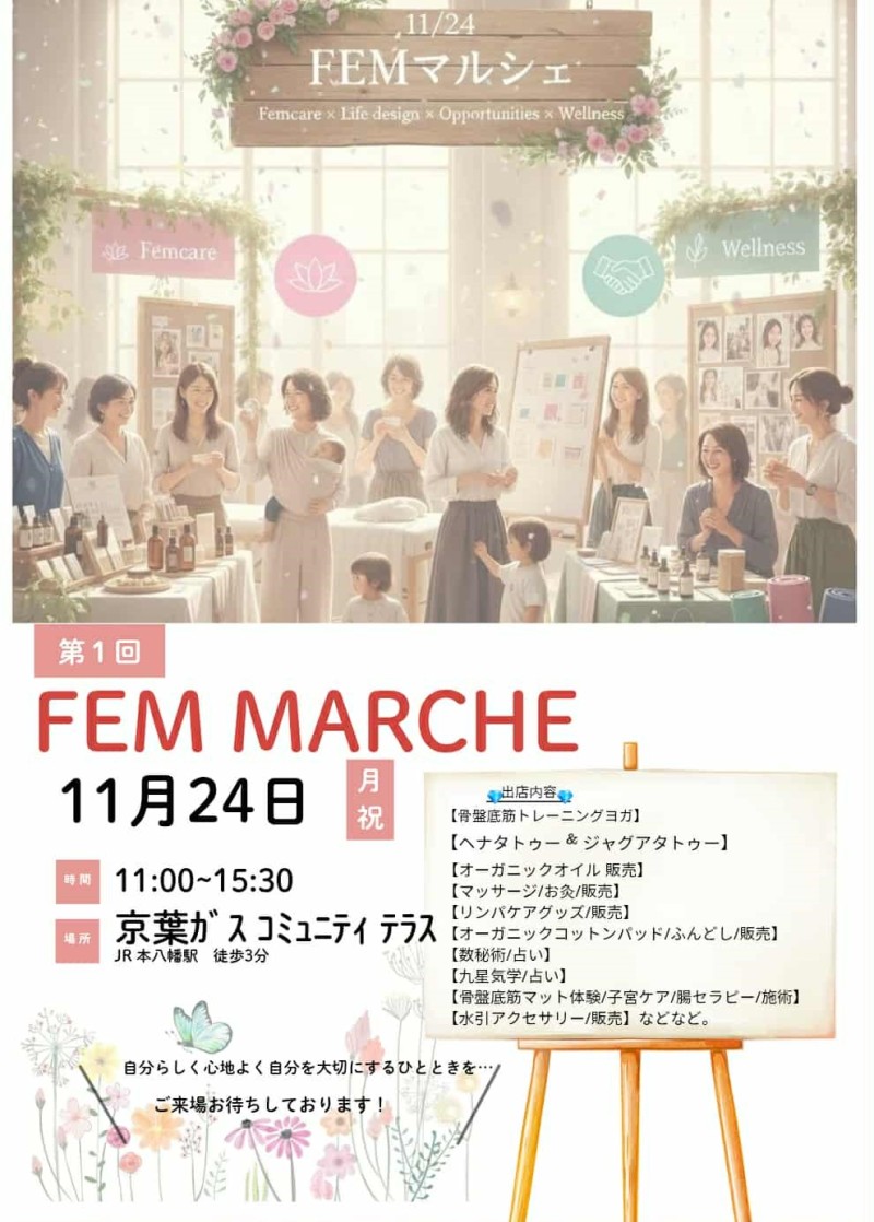 2025年11月24日(月祝)『第一回 FEM マルシェ』を開催し、心癒は出店します。